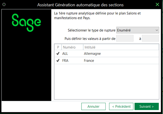 Si l’énuméré est coché, il sera generé lors de la création des sections analytiques. Dans le cas contraire, l’enuméré est ignoré.